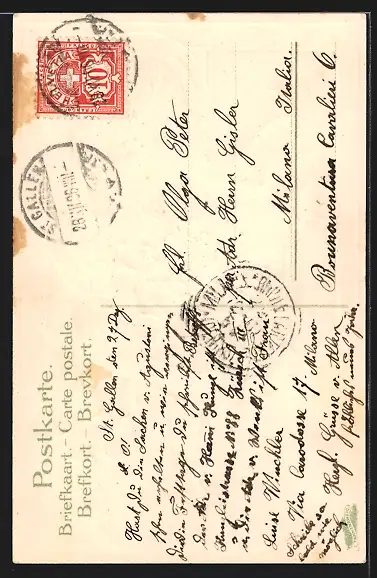 Personenbezogene Daten auf der Rückseite der Karte wurden durch blauen Textmarker unkenntlich gemacht. Die blauen Stellen sind auf die Vorderseite durchgeweicht und wirken sich negativ auf das Postkartenfoto aus