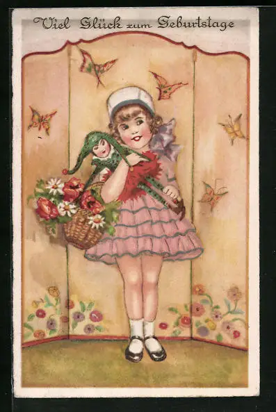 Künstler-AK Mädchen mit Puppe und Blumenkorb