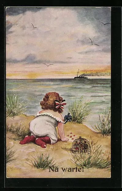 Künstler-AK Mädchen mit Spielzeug-Geschütz am Strand