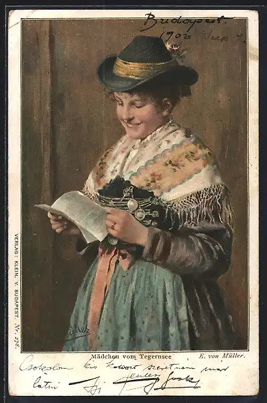 Künstler-AK Mädchen vom Tegernsee liest einen Brief