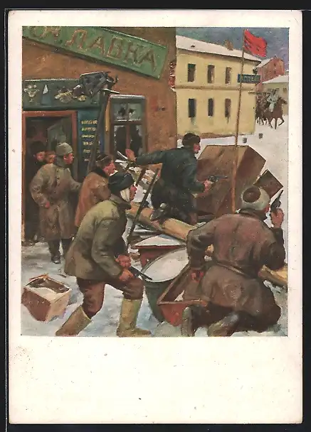 Künstler-AK Männer schützen sich hinter einer Strassenbarrikade, Revolution 1905