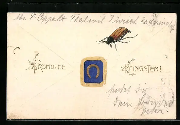 Künstler-AK Maikäfer krabbelt auf Briefkuvert, Hufeisen, Pfingstgruss