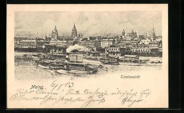 Künstler-AK Mainz, Totalansicht mit Dampfern