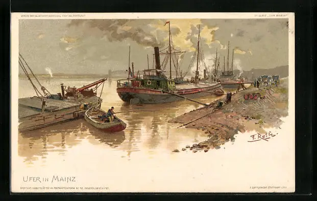 Künstler-AK Mainz, Uferpartie mit Dampfboot