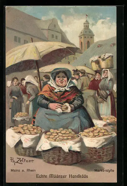 Künstler-AK Mainz a. Rhein, Marktfrau mit ihrem Handkäse