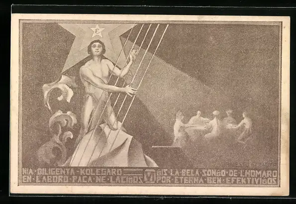 Künstler-AK Mann mit riesiger Harfe, Esperanto