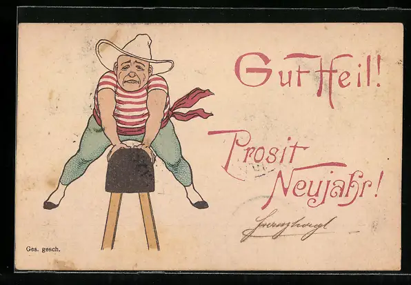 Künstler-AK Mann springt über den Bock