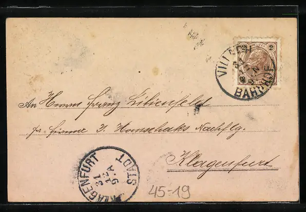Personenbezogene Daten auf der Rückseite der Karte wurden durch blauen Textmarker unkenntlich gemacht. Die blauen Stellen sind auf die Vorderseite durchgeweicht und wirken sich negativ auf das Postkartenfoto aus