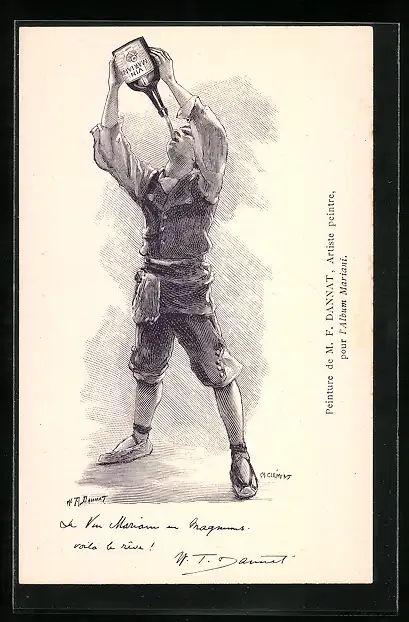 Künstler-AK Mann trinkt Mariani-Wein, Reklame