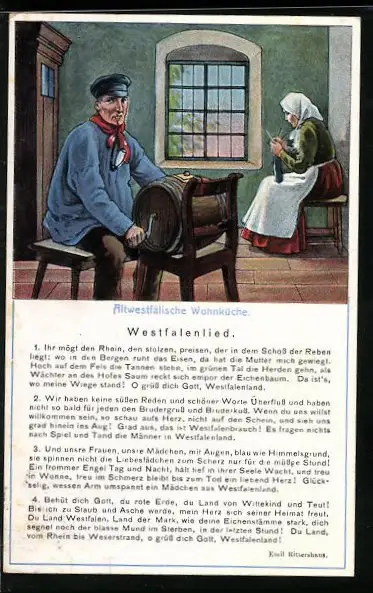 Künstler-AK Mann u. Frau in Tracht in ihrer Altwestfälischen Wohnküche
