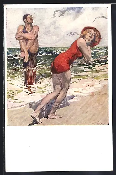 Künstler-AK Mann und Frau in Badeanzügen am Strand, Bademode