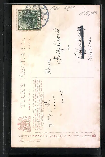 Personenbezogene Daten auf der Rückseite der Karte wurden durch blauen Textmarker unkenntlich gemacht. Die blauen Stellen sind auf die Vorderseite durchgeweicht und wirken sich negativ auf das Postkartenfoto aus