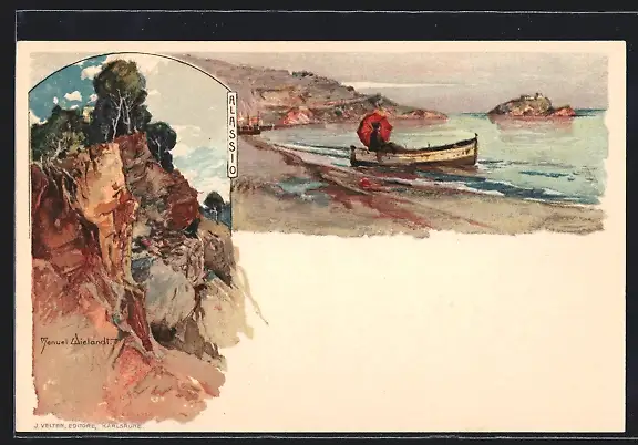 Künstler-AK Manuel Wielandt: Alassio, Strandpartie mit Boot, Felsen mit Bäumen