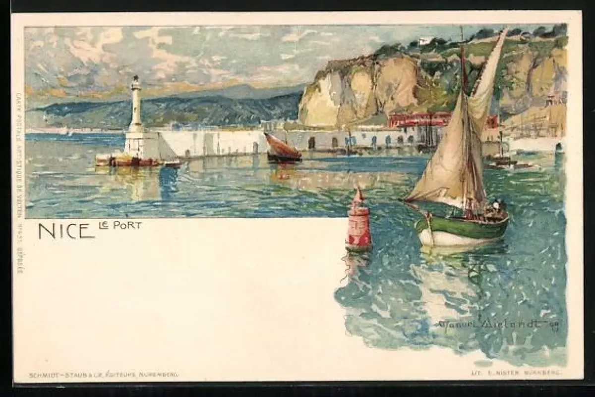 Künstler-AK Manuel Wielandt: Nice, le Port, Hafen mit Leuchtturm und Segelbooten