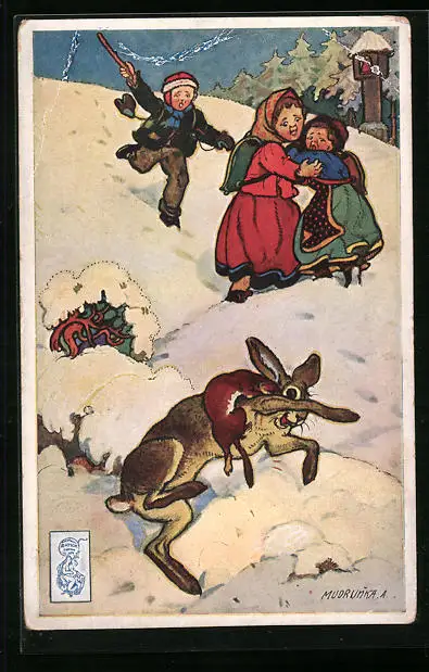 Künstler-AK Marder greift Kaninchen im Schnee an
