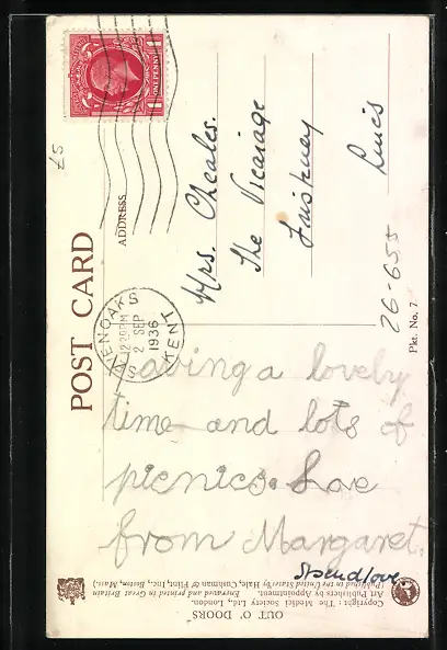 Personenbezogene Daten auf der Rückseite der Karte wurden durch blauen Textmarker unkenntlich gemacht. Die blauen Stellen sind auf die Vorderseite durchgeweicht und wirken sich negativ auf das Postkartenfoto aus