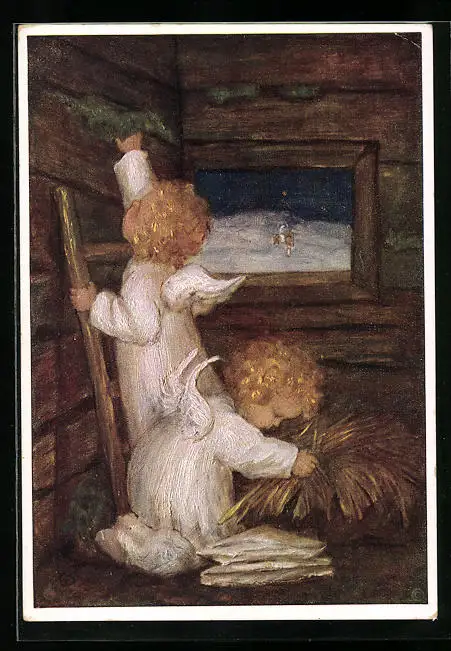Künstler-AK Maria Spötl: Heiliger Abend, Engel in Hütte