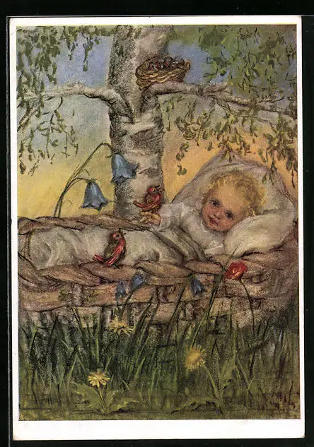 Künstler-AK Maria Spötl: Kind in einem Körbchen mit Singvögeln