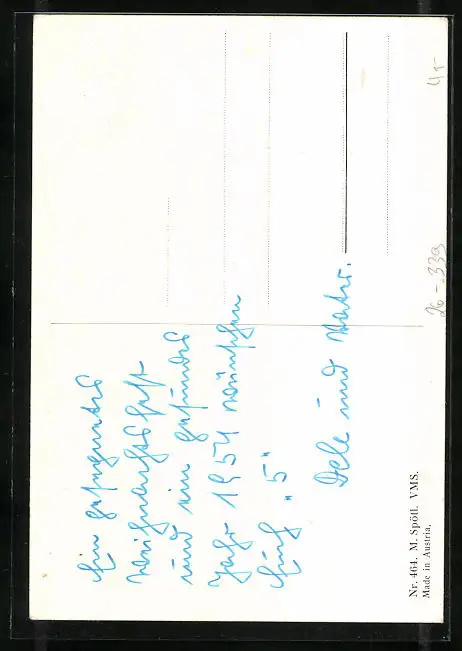 Personenbezogene Daten auf der Rückseite der Karte wurden durch blauen Textmarker unkenntlich gemacht. Die blauen Stellen sind auf die Vorderseite durchgeweicht und wirken sich negativ auf das Postkartenfoto aus