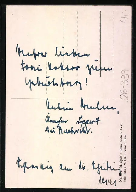 Personenbezogene Daten auf der Rückseite der Karte wurden durch blauen Textmarker unkenntlich gemacht. Die blauen Stellen sind auf die Vorderseite durchgeweicht und wirken sich negativ auf das Postkartenfoto aus