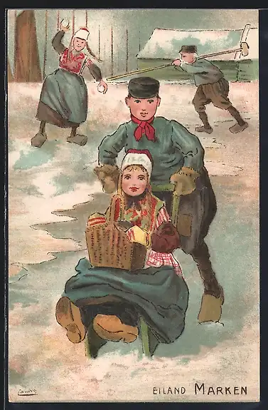 Künstler-AK Marken, Niederländer schiebt Frau auf Schlitten