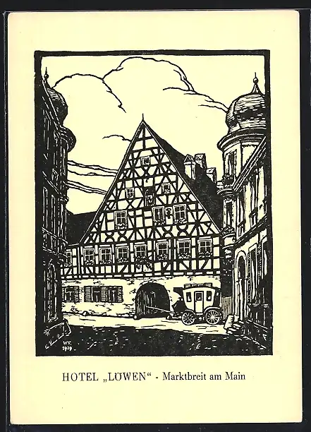 Künstler-AK Marktbreit am Main, Hotel Löwen im Fachwerkhaus