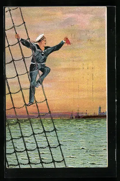 Künstler-AK Matrose winkt aus den Wanten eines Kriegsschiffes