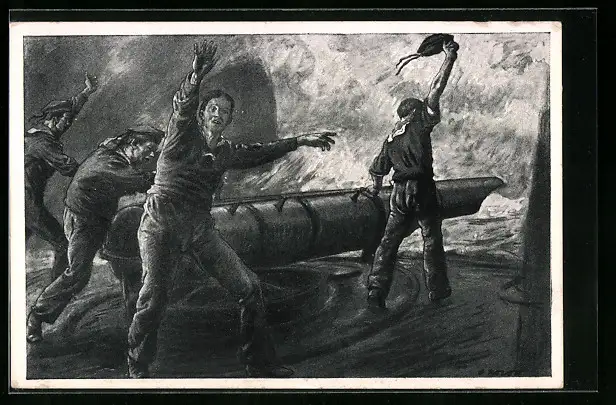 Künstler-AK Matrosen am Lancierrohr eines Kriegsschiffes