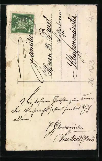 Personenbezogene Daten auf der Rückseite der Karte wurden durch blauen Textmarker unkenntlich gemacht. Die blauen Stellen sind auf die Vorderseite durchgeweicht und wirken sich negativ auf das Postkartenfoto aus