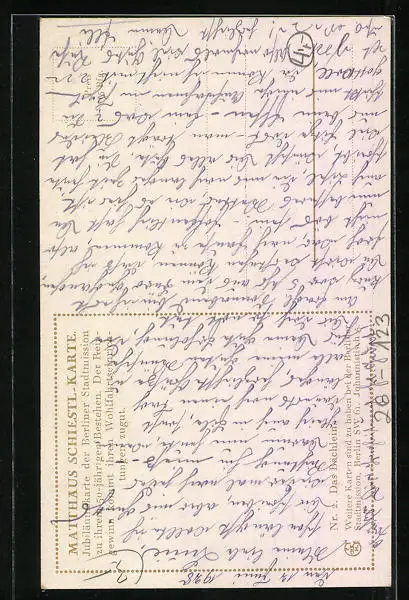 Personenbezogene Daten auf der Rückseite der Karte wurden durch blauen Textmarker unkenntlich gemacht. Die blauen Stellen sind auf die Vorderseite durchgeweicht und wirken sich negativ auf das Postkartenfoto aus