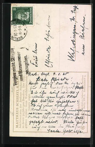 Personenbezogene Daten auf der Rückseite der Karte wurden durch blauen Textmarker unkenntlich gemacht. Die blauen Stellen sind auf die Vorderseite durchgeweicht und wirken sich negativ auf das Postkartenfoto aus