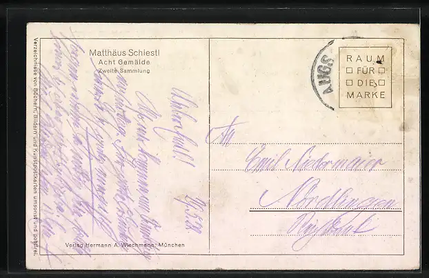 Personenbezogene Daten auf der Rückseite der Karte wurden durch blauen Textmarker unkenntlich gemacht. Die blauen Stellen sind auf die Vorderseite durchgeweicht und wirken sich negativ auf das Postkartenfoto aus