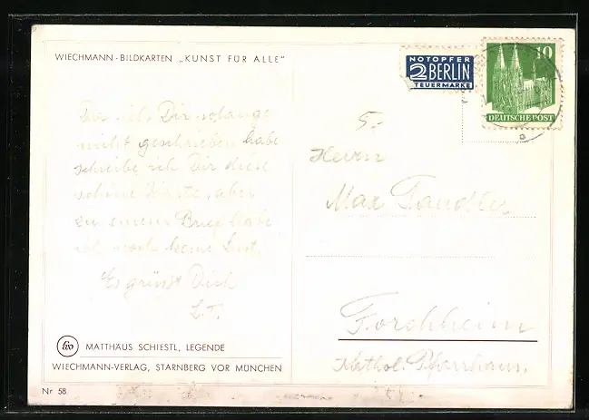 Personenbezogene Daten auf der Rückseite der Karte wurden durch blauen Textmarker unkenntlich gemacht. Die blauen Stellen sind auf die Vorderseite durchgeweicht und wirken sich negativ auf das Postkartenfoto aus
