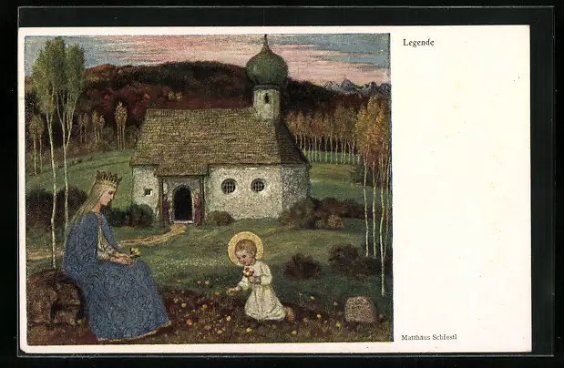 Künstler-AK Matthäus Schiestl: Legende, Maria mit Jesuskind vor einer Kirche