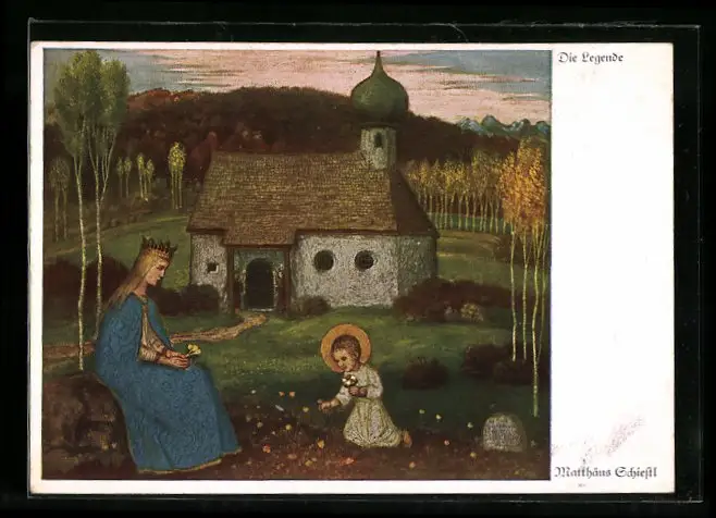 Künstler-AK Matthäus Schiestl: Legende, Maria mit blumenpflückendem Jesuskind