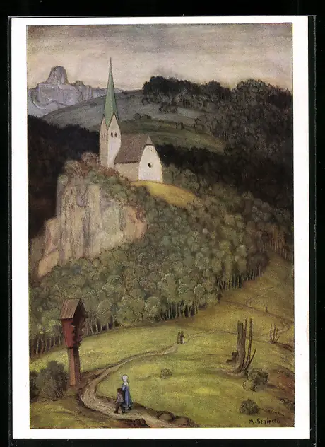 Künstler-AK Matthäus Schiestl: Ortsansicht mit Kirche