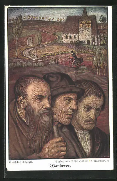 Künstler-AK Matthäus Schiestl: Wanderer auf den Feldern