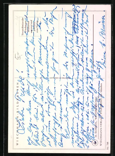 Personenbezogene Daten auf der Rückseite der Karte wurden durch blauen Textmarker unkenntlich gemacht. Die blauen Stellen sind auf die Vorderseite durchgeweicht und wirken sich negativ auf das Postkartenfoto aus