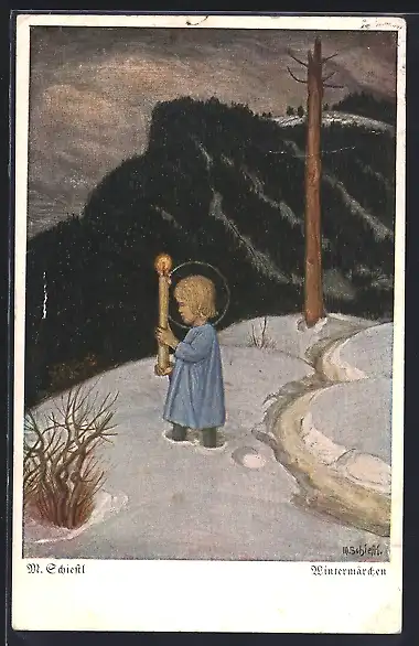 Künstler-AK Matthäus Schiestl: Wintermärchen, Junge trägt Kerze durch den Schnee