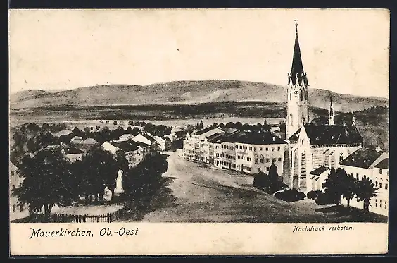 Künstler-AK Mauerkirchen /Ob.-Oest., Strassenpartie mit Kirche