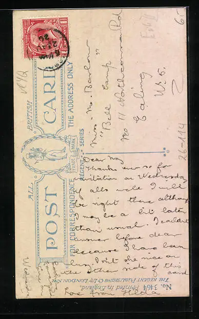 Personenbezogene Daten auf der Rückseite der Karte wurden durch blauen Textmarker unkenntlich gemacht. Die blauen Stellen sind auf die Vorderseite durchgeweicht und wirken sich negativ auf das Postkartenfoto aus