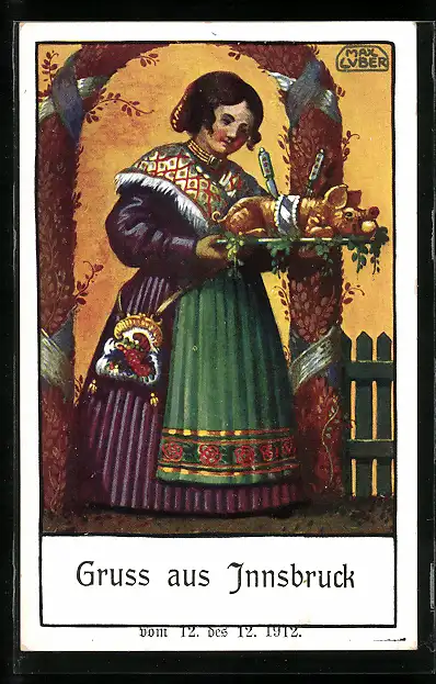 Künstler-AK Max Luber: Frau trägt Tablett mit Spanferkel