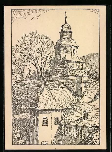 Künstler-AK Meerholz, Schlosshofwinkel und Kirchturm
