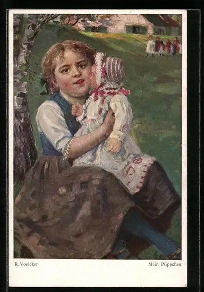 Künstler-AK Mein Püppchen, Mädchen mit Puppe im Garten