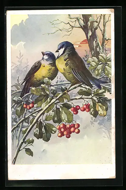 Künstler-AK Meisenpaar auf einem Zweig mit roten Beeren