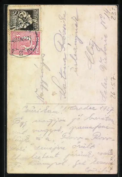 Personenbezogene Daten auf der Rückseite der Karte wurden durch blauen Textmarker unkenntlich gemacht. Die blauen Stellen sind auf die Vorderseite durchgeweicht und wirken sich negativ auf das Postkartenfoto aus