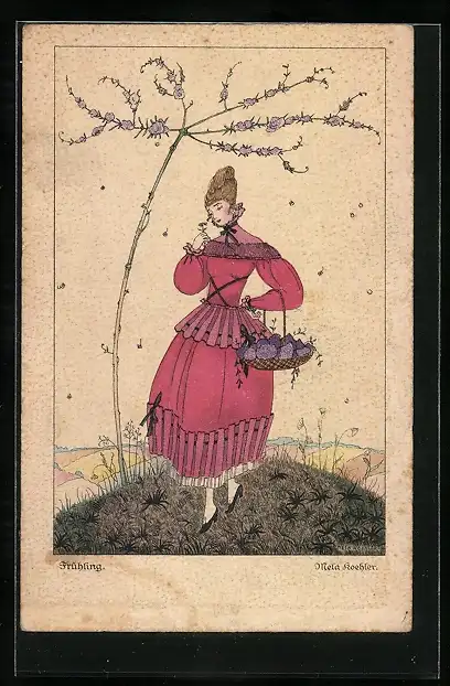 Künstler-AK Mela Köhler: Dame im roten Kleid mit Weinkorb