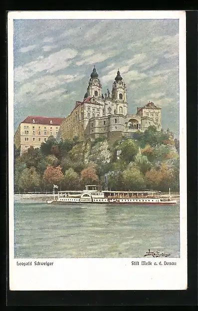 Künstler-AK Melk a.d. Donau, Dampfer am Stift Melk
