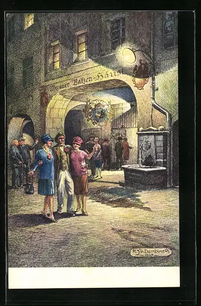 Künstler-AK Meran, Angeheiterte Herrschaften am Restaurant Batzenhäusl
