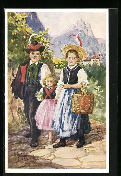 Künstler-AK Meran, Meraner Kinder in Trachtenkleidung